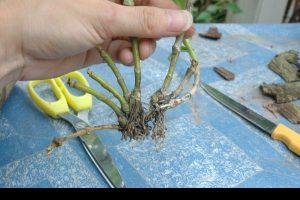 – Sau khi lấy bụi lan ra khỏi chậu, rửa sạch gốc rễ để loại bỏ chất trồng cũ, cắt bỏ rễ già đã bị khô chết, giữ lại rễ còn tốt và cắt ngắn chỉ để dài 5 – 6cm. Dùng dao sắc hơ qua ngọn lửa hoặc lau bằng cồn 90 độ, cắt tách mỗi bụi ra thành nhiều đơn vị, mỗi đơn vị có hai đến ba thân và hai đến ba mắt mầm ngủ, dùng vôi bôi vào chỗ vết cắt để vết cắt không bị hư thối.